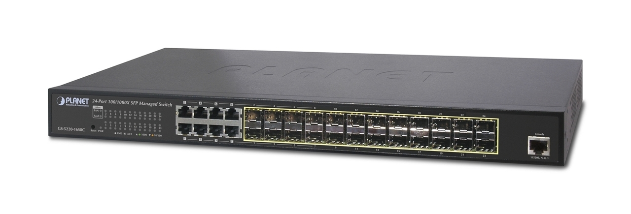L2+ 24-Port 100/1000X SFP with 8 Shared TP Managed Switches, with Hardware Layer3 IPv4/IPv6 Static Routing – (GS-5220-16S8C)